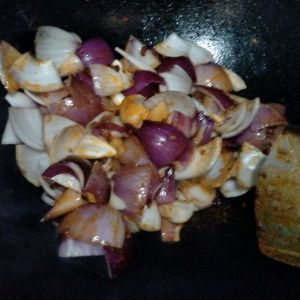 倒入洋葱,炒熟加土豆,翻炒,加入盐,味精,花椒面,辣椒面
