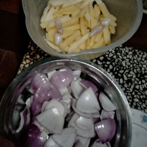 腌制的同时准备好土豆,洋葱,土豆先煮下,后面就熟的快