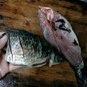 我买了一条3斤的草鱼,中间划开,在鱼背部划上几刀,以便入味。头天晚上先用料酒、生抽、盐和豆豉油先腌渍一晚上。