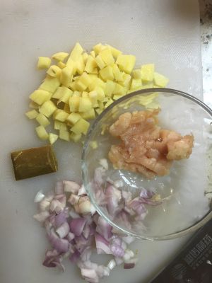 鸡胸肉切丁洋葱土豆全部切丁 咖喱取1/6块