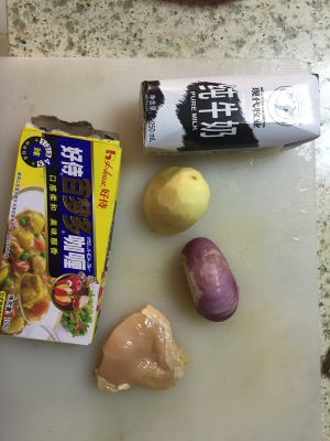 准备一两鸡胸肉 半个洋葱半个土豆 白多多咖喱 我用的是辣味的其实也没多辣 做给小盆友吃的可以用原味 一瓶纯牛奶 用奶粉冲泡也可以