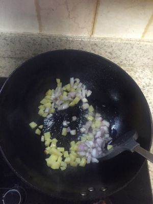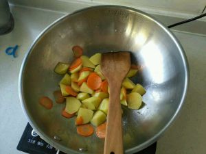 重新倒油放土豆煸炒一会放洋葱如果要放胡萝卜丁会更好看一些与土豆一同入锅放适量盐