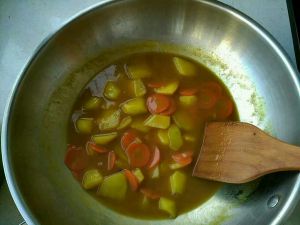 倒入鸡汤,大概两分钟后放入适量的咖喱,加热到土豆变棉,咖喱融化,汤汁粘稠即可。