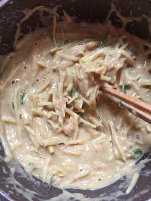 土豆切丝泡水后加入全麦粉、鸡蛋、香葱末、咖喱粉、盐,搅成糊状。