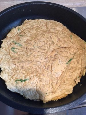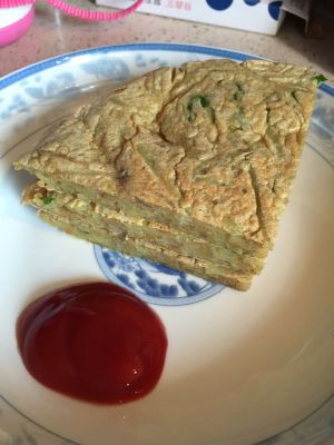 锅内刷油,舀入面糊,用勺子摊平,厚度0.5厘米左右,小火,一面煎3分钟左右即可。