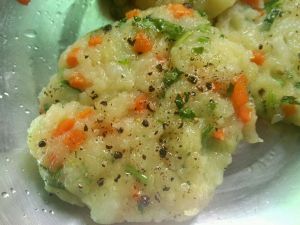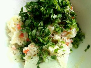 土豆煮熟,摁成土豆泥,胡萝卜切丁,香菜切丝,加入面粉、盐、牛奶和黑胡椒一起拌匀(根据情况可以适当加水),知道成团。