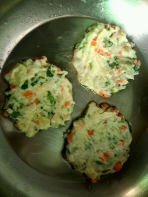 捏成饼状后 先裹层蛋液后裹面粉,入油锅炸,至变色就可以了,超级香的