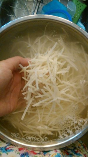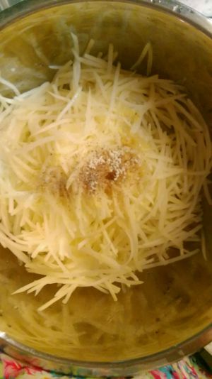 将水沥干,在土豆丝里加入盐、鸡精、胡椒粉、花椒面、姜蒜末搅拌均匀。