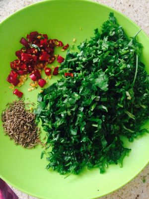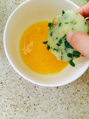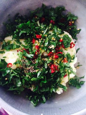 将香菜,辣椒,孜然加入土豆泥中,再调入适量盐,黑胡椒粉,香油,将所有材料搅拌均匀