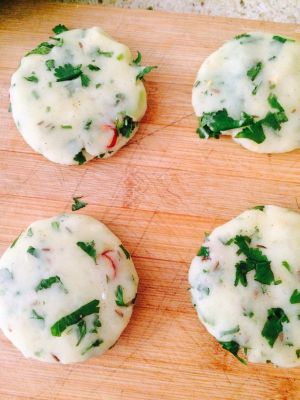 我要分两锅。每个土豆饼有大约10cm直径。这就随机应变吧。多大、分几团、都你随意。薄点。