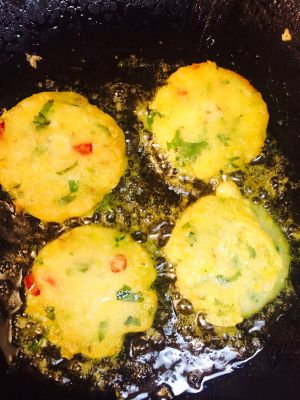 平底锅中倒入适量油,油热后倒入搅拌好的面粉土豆混合物开始煎,一面熟后翻致另一面