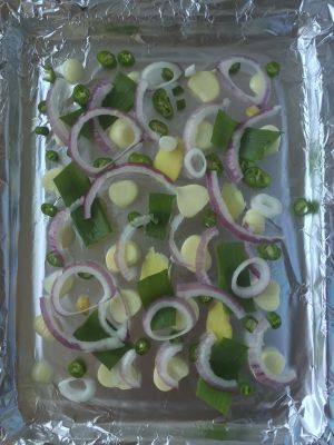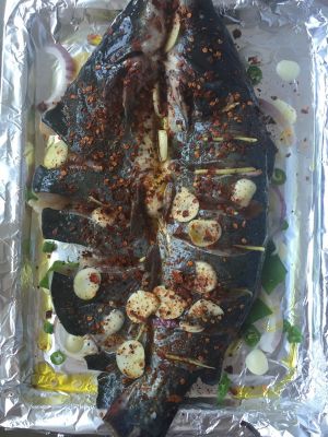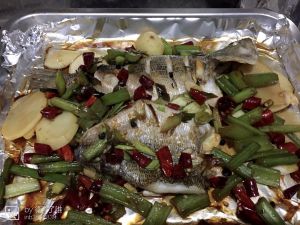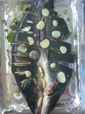 各种料该洗滴洗,该切滴切!鱼是在菜市场买了杀好的,回来再清洗下,用盐,五香粉,孜然,姜,蒜,再滴两三滴白醋(或白酒,去腥味)腌制,腌制半个小时吧!腌制时就把烤盘垫层锡箔纸,上面放上姜、葱、蒜、洋葱和辣椒!