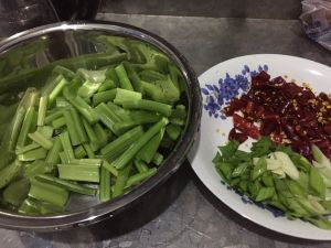 辅料有切条的杏鲍菇、莴笋、西芹和花菜,都要事先处理好备用。倒入油比炒菜的量稍微多一些,煸香葱姜蒜和辣椒酱、洋葱丝、