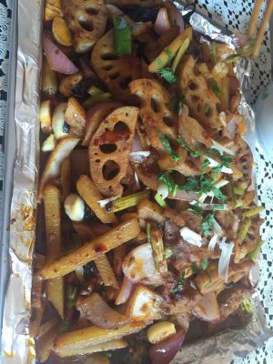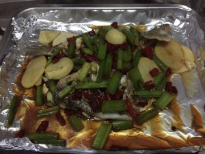烤的同时:锅烧热倒油烧开放干锅料,姜,炒香放土豆,藕块(补充一下:藕我用了半根,根据个人喜好还可添加其他配料)继续炒,再放200-300ml水,让土豆稍软(喜好吃脆土豆的当然根据自己喜好把握火候),再放入洋葱、芹菜(- -#芹菜好像也忘了写进配料里了)、葱、蒜继续炒!把握好时间(最好烤了20分钟后再开始炒),炒好后,鱼也烤得差不多了,再把炒好的料盖在鱼上!放入烤箱继续烤!210度,5分钟左右!