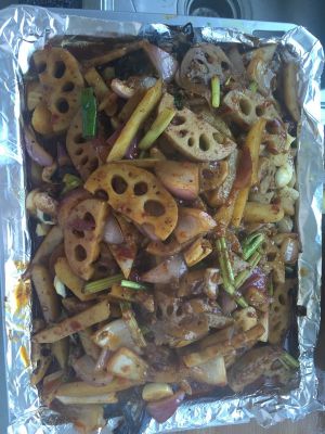 烤制过程中,可以将配菜炒一下至7层熟(喜欢吃菜的可以多加蔬菜)。注意要放花椒,辣椒后加这样颜色才好看。多加点汤,口味重的人也可以加豆瓣酱一起炒。
