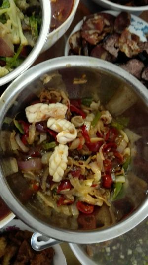 锅内下油烧至八成热,将鱿鱼、泡椒、泡姜、精盐、胡椒、料酒下锅急速爆炒2分钟后下大葱翻匀起锅。