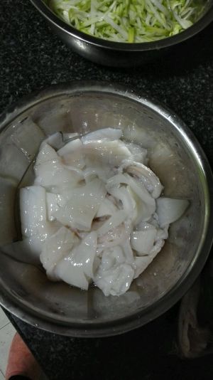 锅内沸水,下鱿鱼迅速汆过,起锅晾凉并以精盐、料酒码芡15分钟后冲洗掉;