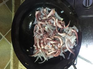 将炒好的洋葱捞起装盘 放入油 鱿鱼翻炒几分钟后加入洋葱再次翻炒