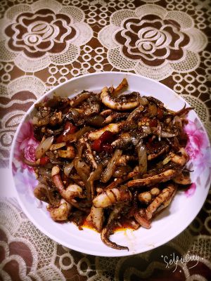 倒入焯过水的鱿鱼花炒熟,加盐和味精,装盘即可。