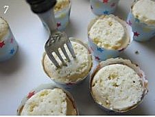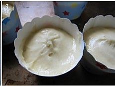 预热烤箱325F/162度,面糊入纸杯,8分满,中层,烘烤15分钟至表面微黄,取出冷却备用。