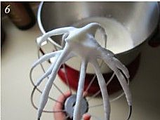水、细砂糖一起倒入锅里加热煮成糖水,直到沸腾,然后关火。一边用打蛋器搅打,一边缓缓倒入第四步打发好的蛋黄。蛋黄倒入完毕以后,继续用打蛋器搅打,约5-10分钟。此时蛋黄糊的温度应该已经降下来了,和手心温度接近。