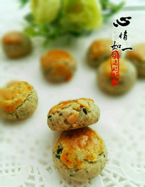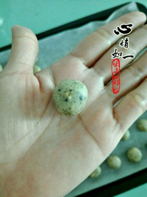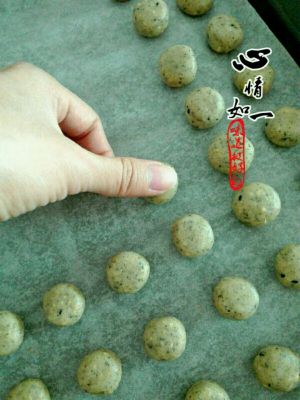 揉好的小球摆放在烤盘上,稍压扁下,每个小球约为5—6克,大了不易熟。