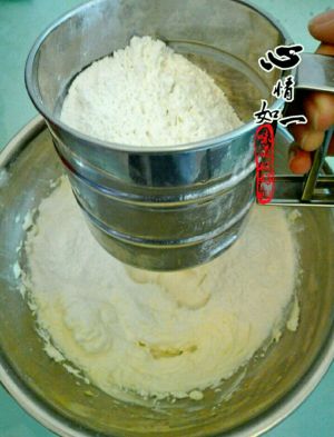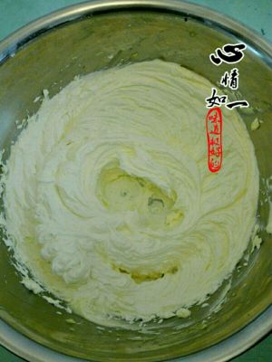 黄油室温软化,加入糖粉、蛋黄,打到颜色变白,体积膨松状态。
