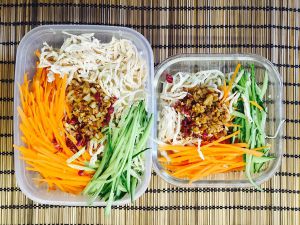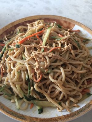 面条过一下凉水后放入碗中,表面放鸡丝,胡萝卜条,黄瓜条装饰,再淋上酱汁