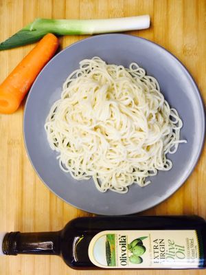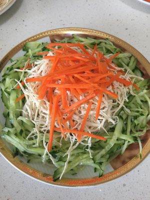 面条煮熟过凉水 摆盘 摆上黄瓜丝胡萝卜丝 鸡丝