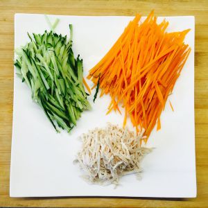 胡萝卜、黄瓜切丝,待鸡胸肉煮好放凉,按照文理撕成细丝