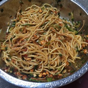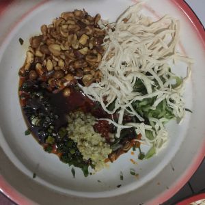 凉面市场上买的,黄瓜切丝放盐(拌前挤掉多余的水分,如果咸了用水冲一下),鸡胸肉凉水下锅煮熟后顺着纹理撕下来,小葱(一定要小葱因为很香)四川家庭必备的红油,蒜泥姜末剁碎后用热油浇一下,花生碎,自己炸好了拍碎的市场也有买