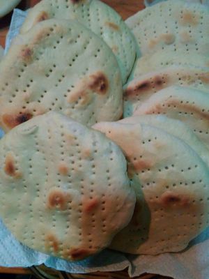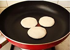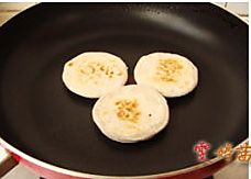 将酵母在20克左右温水中融化,加入30g面粉揉成面团,盖好保鲜膜发酵1小时。将剩余面粉和水揉成较硬的死面团,盖保鲜膜放置半小时。最后将两种面团揉和均匀,至光滑有韧性。接着分割成均等大小,揉圆后用面杖擀成厚度1cm左右面饼。放入锅中无油烙3-5分钟。