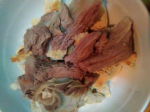 40分钟后肉熟了,拿出一块肉来撕成一块块的,不好意思,因为拿出那块肉忘拍了。只有发这张了。