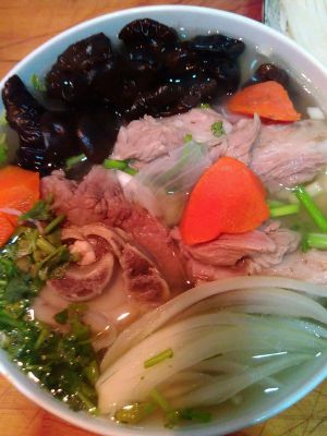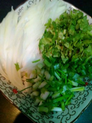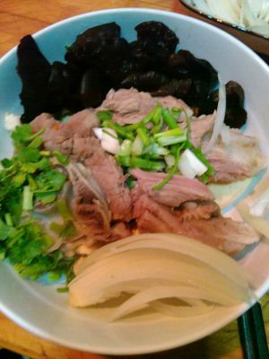 将粉丝烫熟放入碗中,煮好的泡馍连同羊汤倒入大碗,上面放入黑木耳,牛羊肉切片,放置粉丝上,洒上切碎的青蒜香菜,按个人喜好浇入辣椒酱, 或搭配糖蒜吃即可。