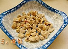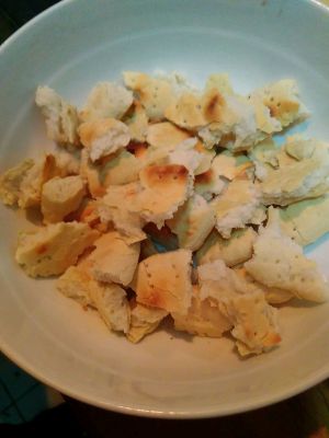 将馍掰成指尖大小或黄豆大小的碎粒,至于碗底备用。