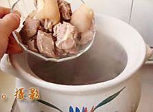 将变白浓稠的汤水倒入大容量砂锅中,倒入泡好的牛羊肉,小火炖煮3小时即可。