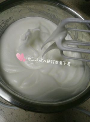蛋清盆中滴几滴白醋,再分三次放入白糖打发至硬性发泡