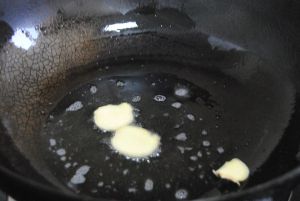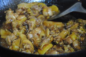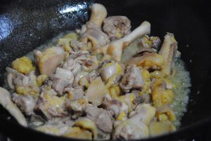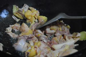 倒入料酒翻炒至冒酒香,鸡块慢慢煸出油