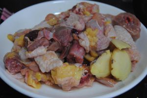 琵琶腿剁成小块,焯水过凉;板栗去皮
