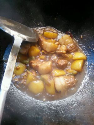 放油爆炒香料,再把五花肉放下去炒,差不多了再放土豆,炒了一会再放水,把所有调料放下去闷
