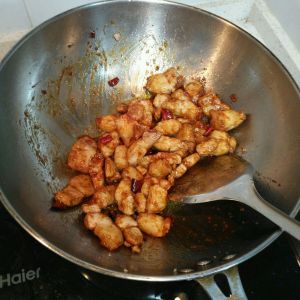 切块之后,煮一下,把肉再用热水把沫洗掉,多放点油,放辣椒段,放肉,把肉多炒炒。感觉肉挺亮了就好了。