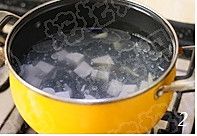 汤锅倒入半锅清水,下入姜丝、豆腐、皮蛋,加两勺盐,一大勺色拉油,大火煮沸;