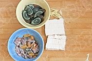 皮蛋两个切瓣,大鳝鱼两条去骨去肠洗净,改刀成片,加少量盐、料酒、生粉、蛋清拌匀,内脂豆腐半盒切成小块,生姜切成细丝;