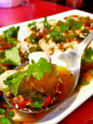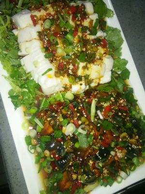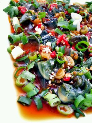 将葱花堆皮蛋周围,淋上料汁完成!