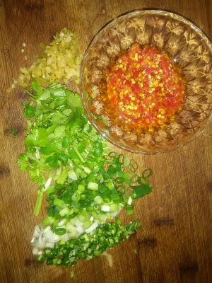 将一半葱花,线椒,榨菜,剁椒酱,生抽,玫瑰醋,麻油,白糖,红油,芝麻混合成料汁