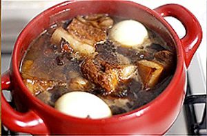 焖煮的时候,时不时用铲子稍微搅动搅动,以免糊锅,顺手煮了俩鸡蛋,拨皮后放进去煮成卤蛋。