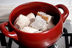 砂锅烧热,不加任何底油,放入冰糖跟五花肉大块,小火煎制,肥肉中的油脂会慢慢融化出来,正好可以化开冰糖。