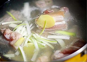 五花肉切块洗净,凉水下锅,加姜片黄酒焯水。