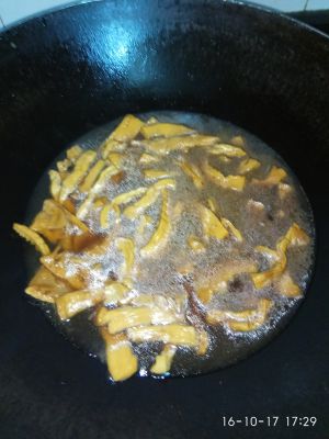 在锅里倒入少许油,烧热后加入生姜,香葱,爆出香味,倒入肉块,煸炒成金黄色
