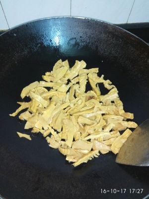 笋干隔天浸泡,期间要勤换水,把笋干的涩味抓出来,然后切成小条状。